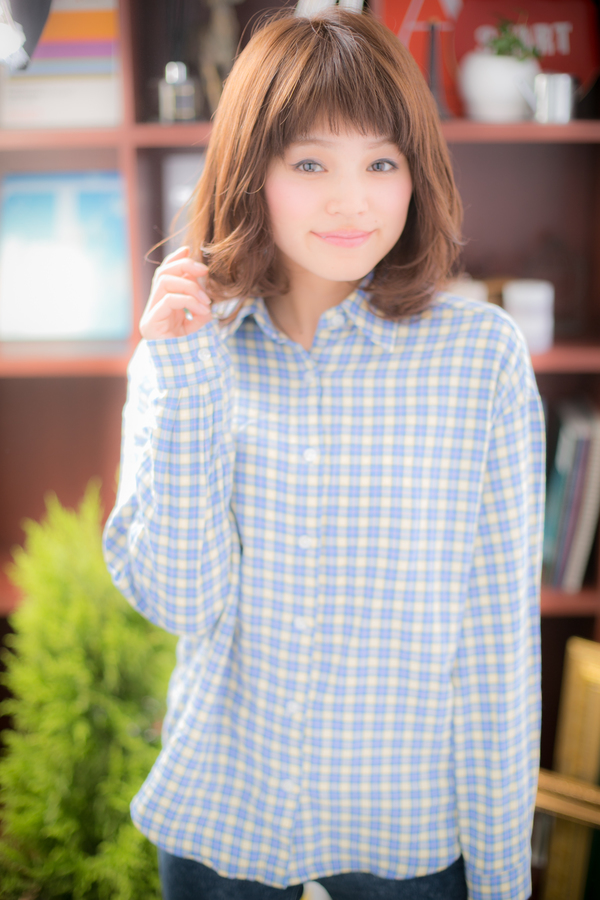 計算ずくの短めのラウンドバングにパーマをプラスしたふわミディがガーリーなおしゃれ感を☆伸ばしかけの方には断然カールがおすすめ☆レイヤーをあまりいれず,ふわミディにしても大人かわいい仕上がりに。