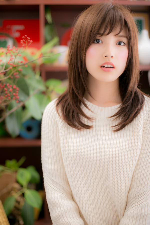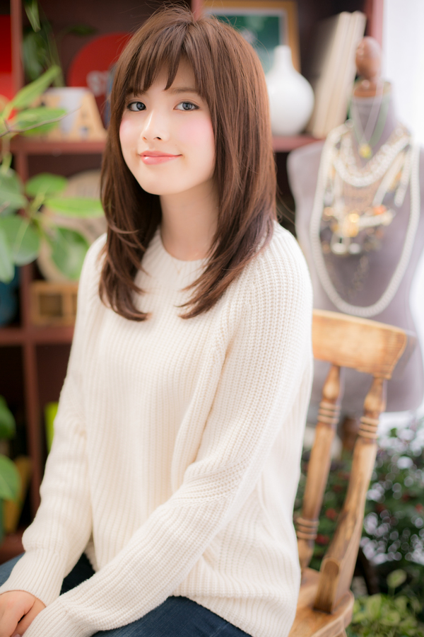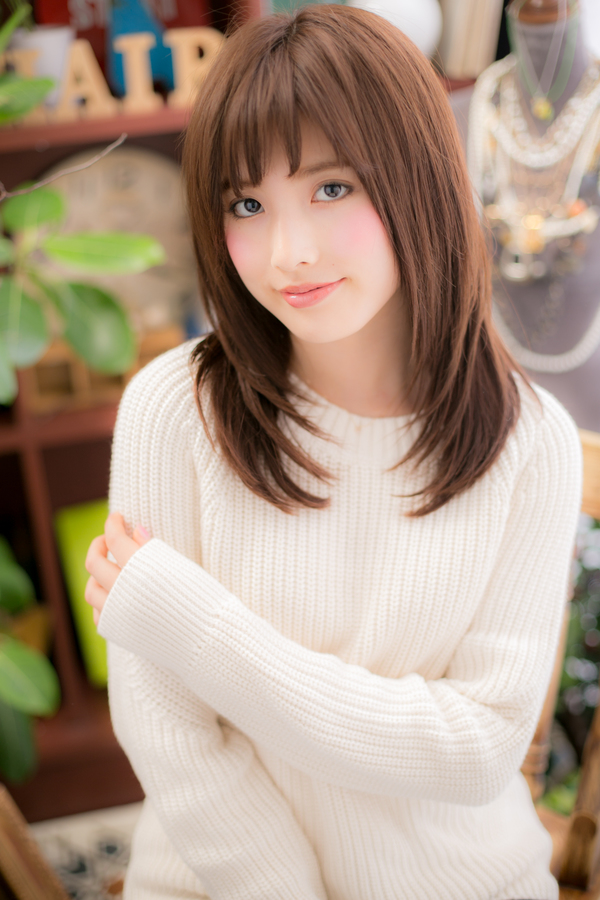 女っぽさUPな人気のワンカールストレートはクールな印象と柔らかさをプラスしてくれます。毛先メインのナチュラルなカールと眉ラインにカットされたバングでラブリーに☆