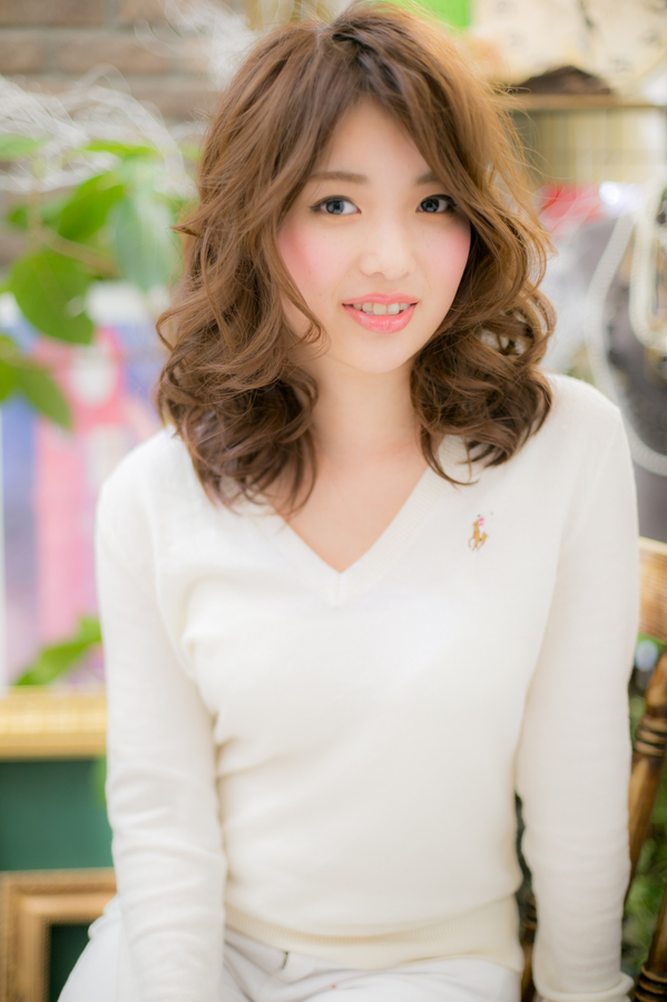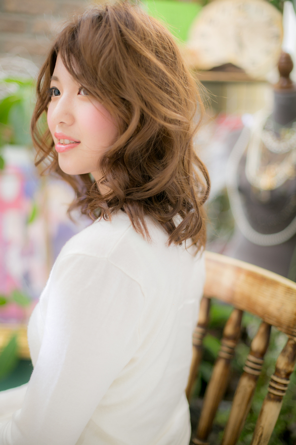 前髪は作らず目のあたりから大きめのウェーブを。明るい柔らかなカラーと弾むウェーブが大人な可愛さを☆耳にかけてすっきり顔を出しても印象を変えられます。