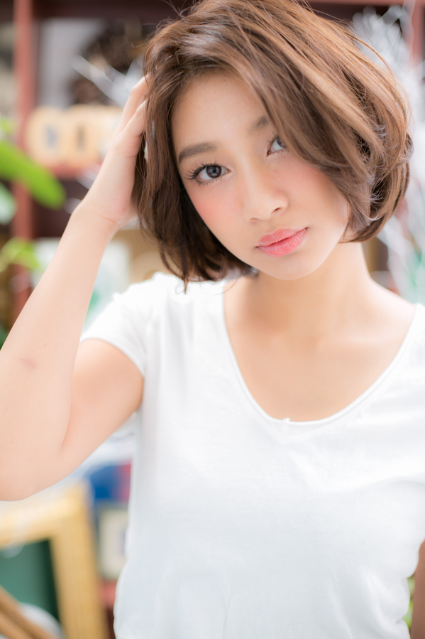ローレイヤーの重めスタイルに明るめのベージュカラー、毛先のワンカールパーマで女っぷりを上げたフェミニンスタイル。短めスタイルの初心者の方にもオススメできるスタイルです。