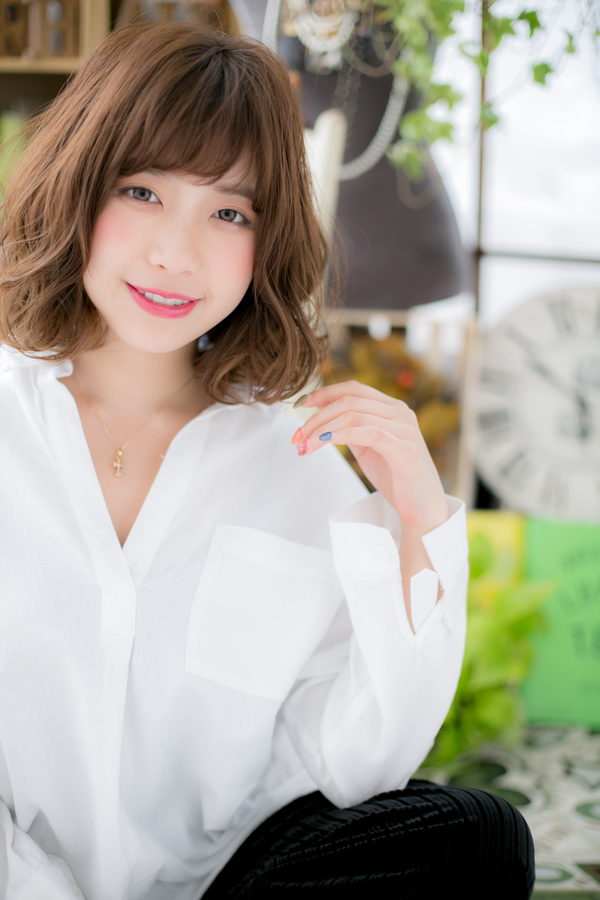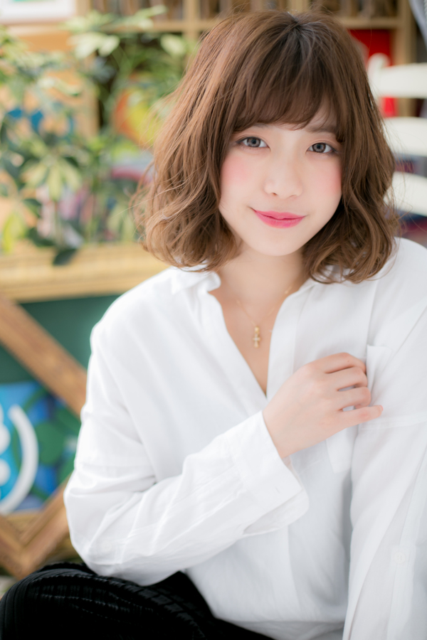 目力UPの斜めバングと前下がりラインで小顔に見せた愛されふわミディなヘアスタイルです。ラフなくせ毛風カールでこなれ感を出して、ナチュラルボブや前下がりボブにヘアアレンジ。厚めバングや耳かけで大人女子のファション度UP!トリートメントしたようなカラーリングで髪の悩みも解消する人気のカラーもおすすめ!(メイク担当:北浦和店 棟方)