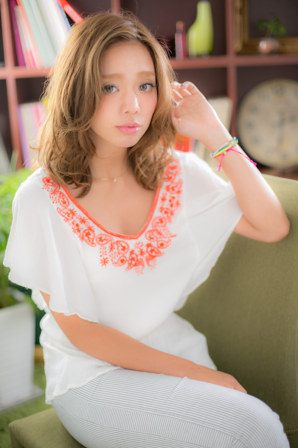 ふんわり,空気感のあるウェーブと透きとおるツヤカラーが抜け感ある魅力的なふわミディスタイル。ナチュラルな質感のオシャレ上級者ウェーブ。柔かいボリュームがスタリングの幅を広げます!かきあげバング,斜めバングやセンターパート,色々試して♪