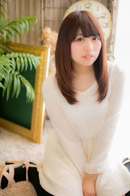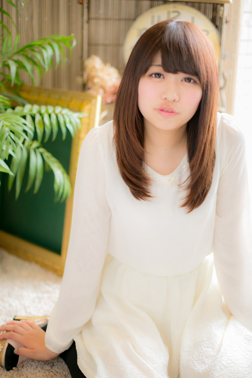 全体はセミロングのレイヤースタイル。バングは目の上ギリギリに流すことで、目を大きく見せてくれます♪