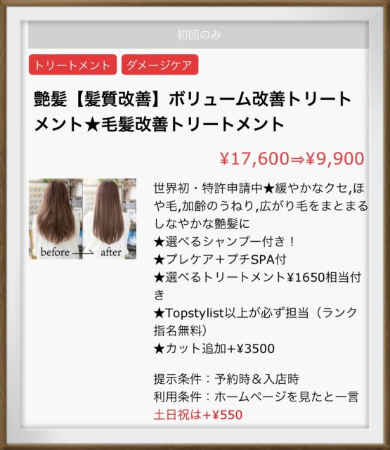 約1ヶ月程サラサラでツヤのある、まとまりやすいヘアスタイルがお楽しみ頂けます。