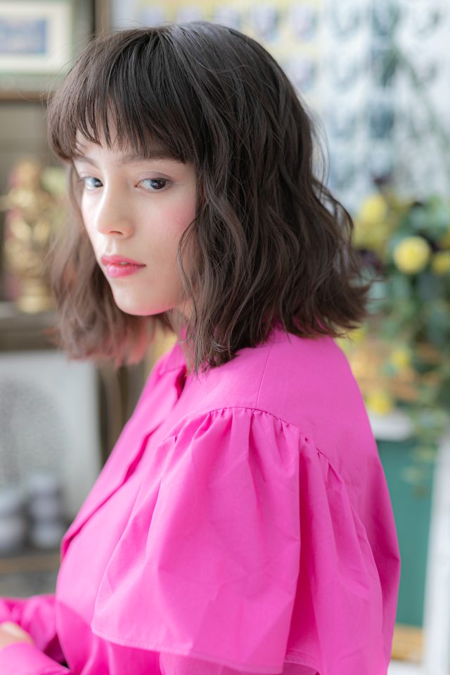 くせ毛風ゆるふわミディは耳かけが大人かわいい。小顔前下がり。斜めバングや厚めバングで目力UP。ナチュラルボブやフェミニンボブ、大人ボブや前下がりボブ、切りっぱなしボブやウルフも◎(メイク担当:川口店 成田)