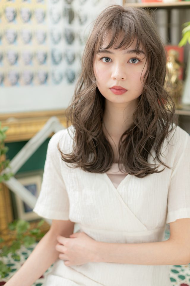 ハイトーンxくせ毛風パーマで自然に陰影ができて3Dヘアスタイルが完成。眉上バングであざとさ◎ふわミディやくびれミディからの伸ばしかけに。センターパートや耳かけも大人かわいい。(メイク担当:川口店成田)
