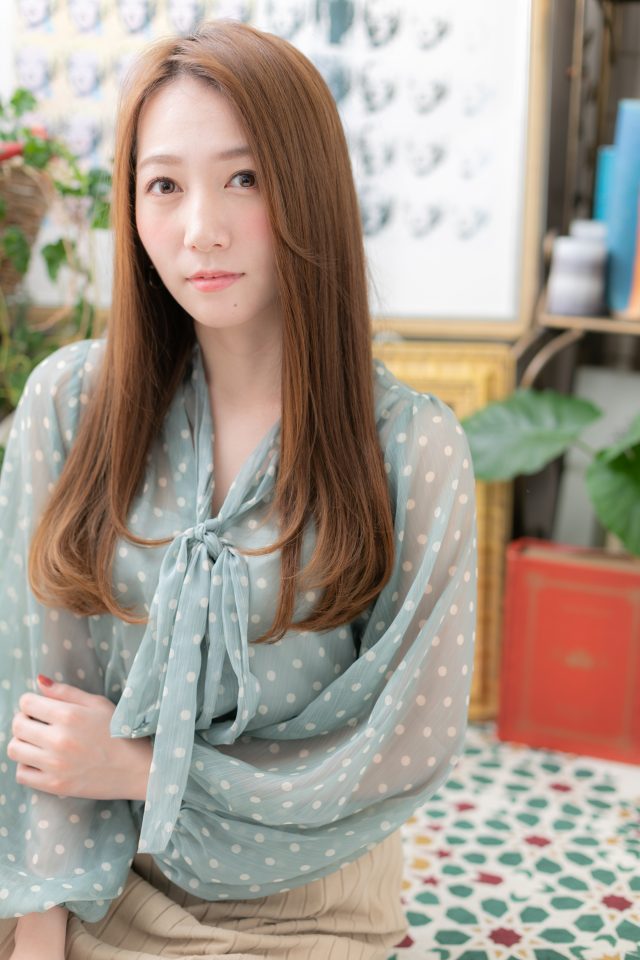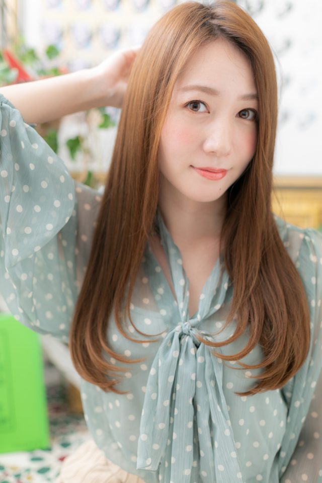 重めスタイルになりがちなストレートロングは、トリートメントしたようなカラーリングで髪の毛の悩み解決。人気のカラーやツヤ感ブラウンベージュカラーで。アシンメトリーに仕上げたかきあげバングでこなれ感を出して大人女子のコーデを完成。(メイク担当:川口店成田)