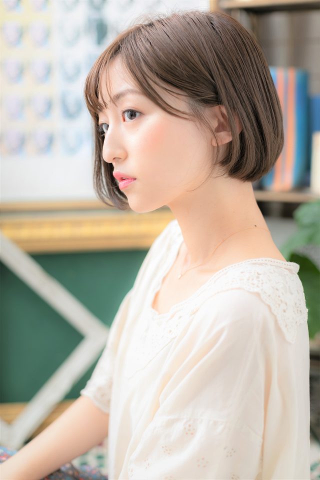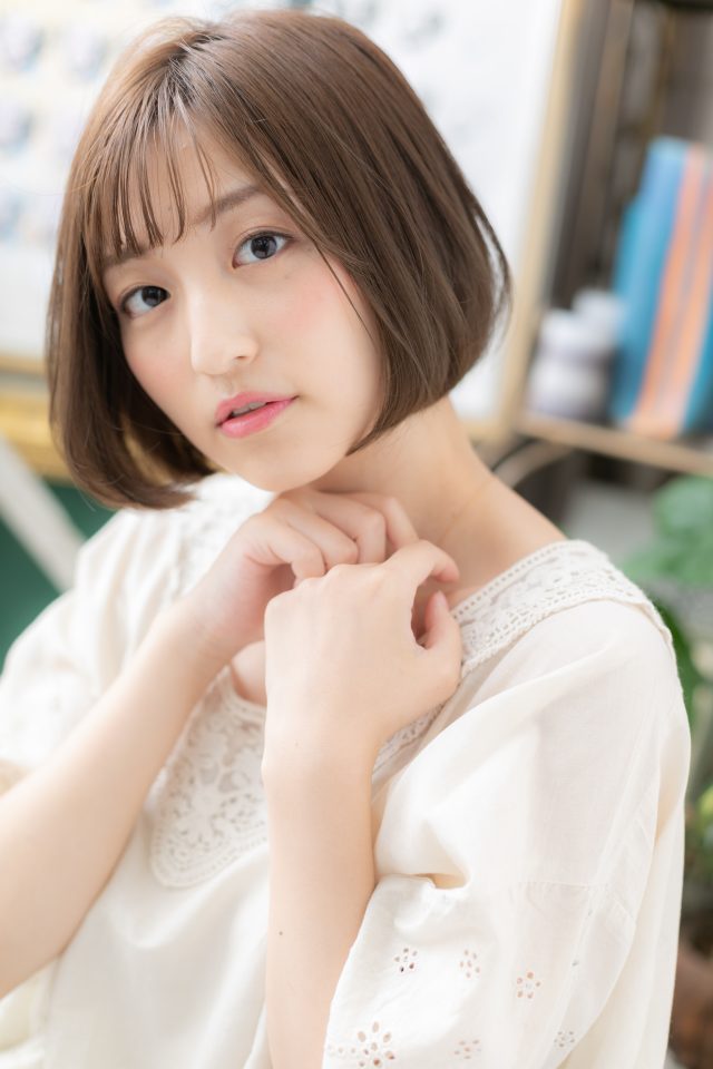 輪郭をカバーして小顔見せ効果を狙った前下がりボブのヘアスタイル。シースルーバングで透け感を出して大人かわいい雰囲気で大人女子のファッション度UP。ミディアムヘアを際立たせるグラデーションもおすすめ。(メイク担当:川口店成田)