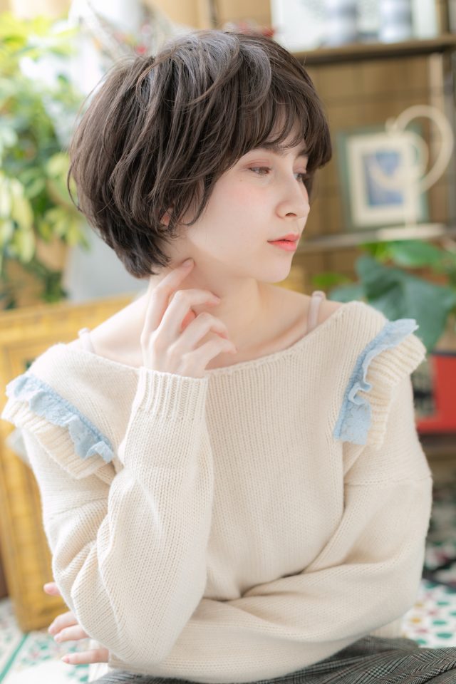 ボーイッシュに見えがちなマッシュショートをガーリーにヘアアレンジした大人ショート。くせ毛風ニュアンスカールで動きを出し黒髪風ダークカラーでシックなヘアスタイルで大人女子のファッション度UP。小顔見せ効果も◎(メイク担当:COVERHAIRGROUP中田)