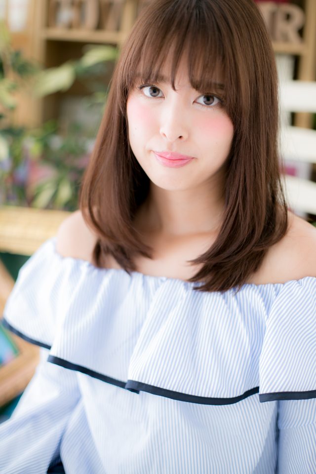 暗髪ローレイヤーの重めスタイルは、透け感ある斜めバングとツヤ感ワンカールで軽やかに。くせ毛風カールのふわミディや厚めバングで目力強調してもOK。耳かけも大人かわいい♪(メイク担当:北浦和店 棟方)