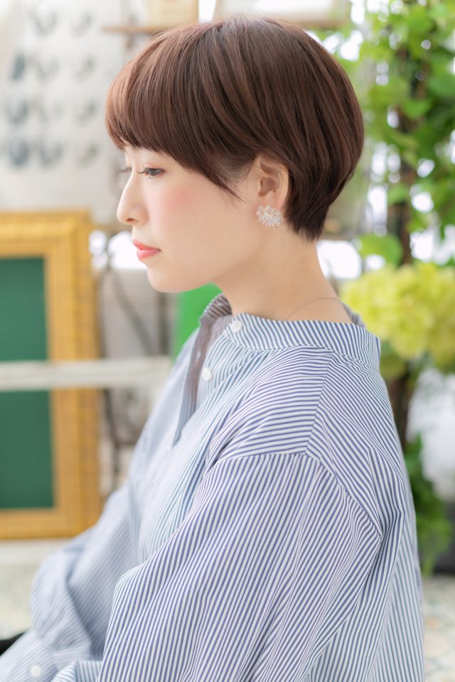 前下がりで小顔見せした丸みショート。斜めバングや厚めバングで目力UPで大人女子のコーデも人気。30代・40代にもおすすめ!(メイク担当:川口店 成田)