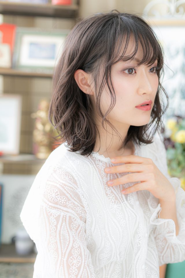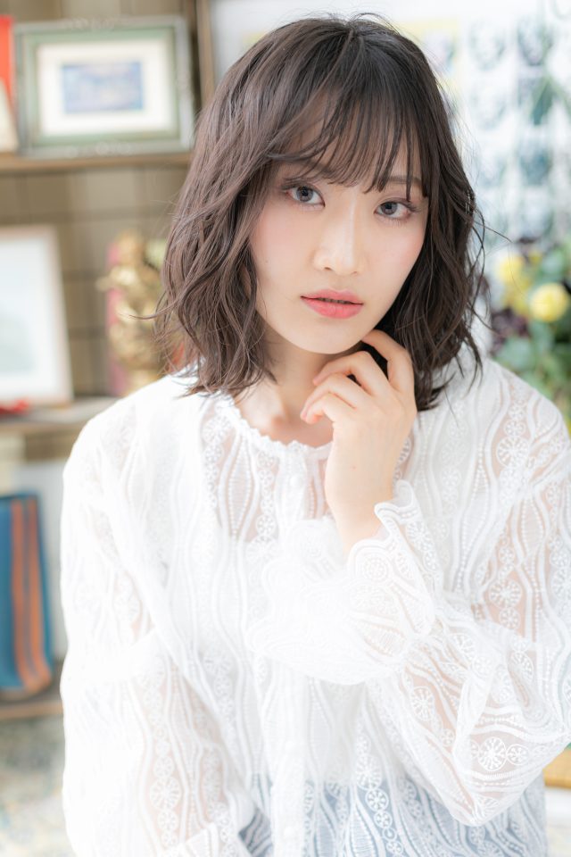 くせ毛風ゆるふわミディや耳かけで韓国風が大人かわいい。前下がりで小顔。斜めバングや厚めバングで目力UP。ナチュラルボブやフェミニンボブ、大人ボブや前下がりボブからのイメチェンに◎(メイク担当:川口店 岩淵)