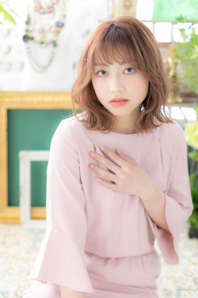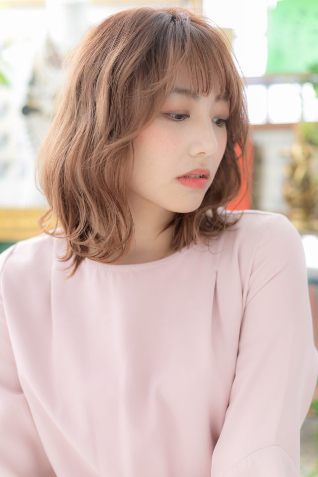 斜めバングや厚めバングが大人かわいいくせ毛風ふわミディ。前下がりで小顔。ナチュラルボブやフェミニンボブ、大人ボブや前下がりボブからの伸ばしかけに◎耳かけやアシンメトリーな髪形も◎(メイク担当:川口店 岩淵)