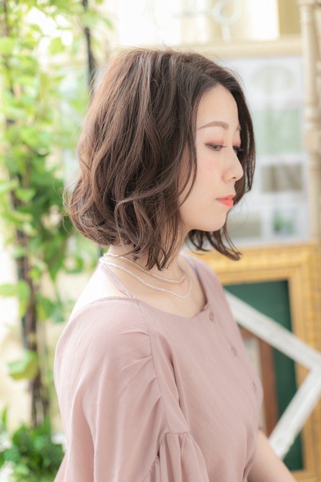 ナチュラルボブやフェミニンボブ、大人ボブや前下がりボブからのイメチェンに。斜めバングや厚めバング、前下がりで小顔。くせ毛風ゆるふわミディや耳かけ外ハネウルフも大人かわいい。(メイク担当:川口店 伊与田)