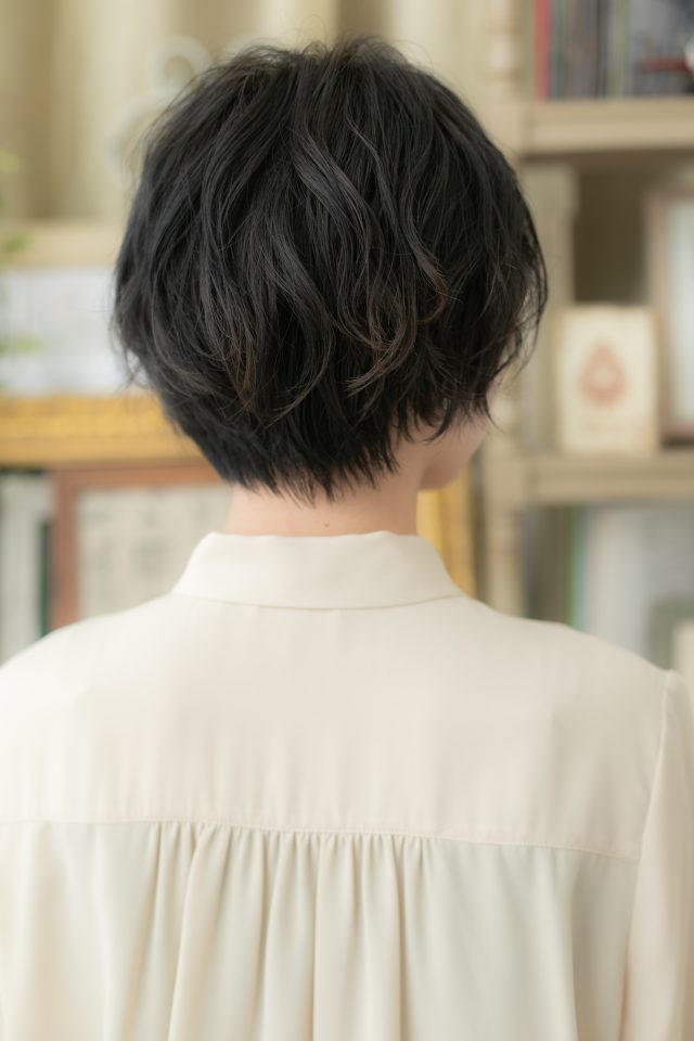 大人かわいい黒髪ウェットヘア束感ショート