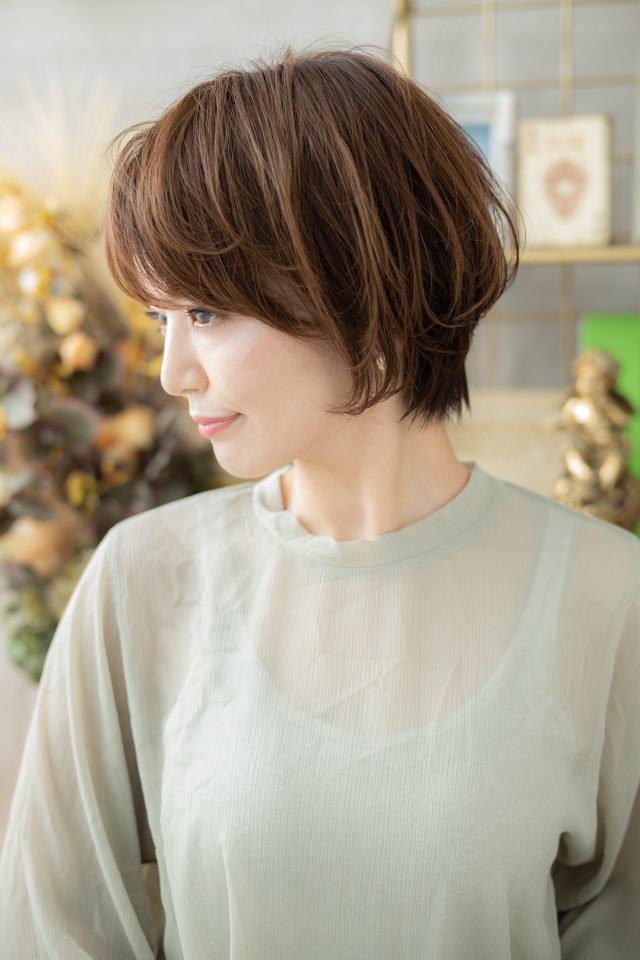 丸みショートくびれショート、ショートマッシュも人気。くせ毛風ゆるふわミディや耳かけ前下がりウルフも大人かわいい。斜めバング厚めバング、シースルーバングかきあげ前髪で小顔。(メイク担当:川口店岩渕)