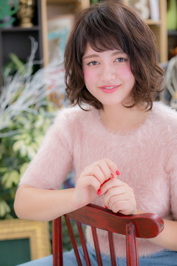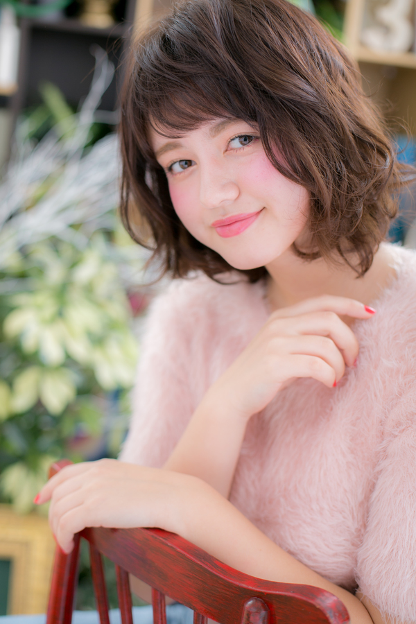 頬にかかるカールがやわらかな印象を醸すフェミニンボブ。高めの位置からパーマをかけることで、軽くてエアリーなゆるふわ感を演出します。