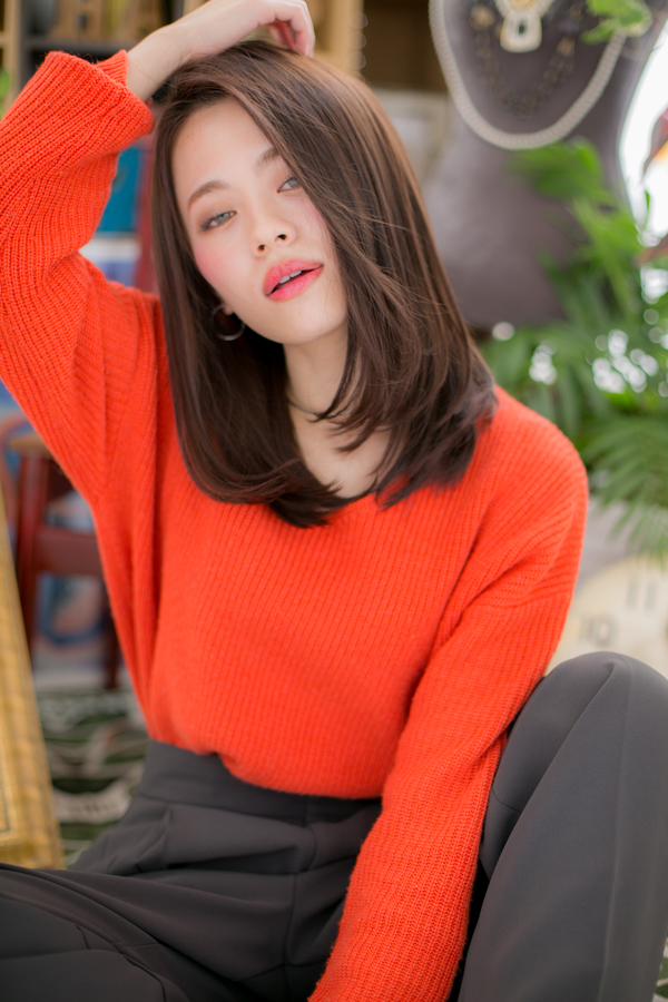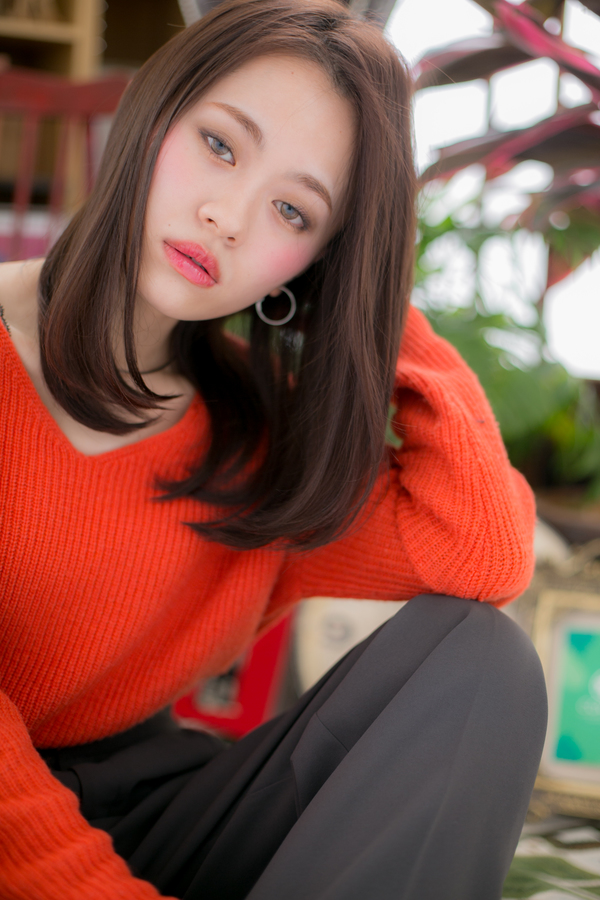 ノーバングでしっとりまとまった美髪ストレート。毛先の内巻きでフェミニンな雰囲気に。透明感あるアッシュ系やほんのり色っぽいレッド・ピンク系も肌色キレイで◎