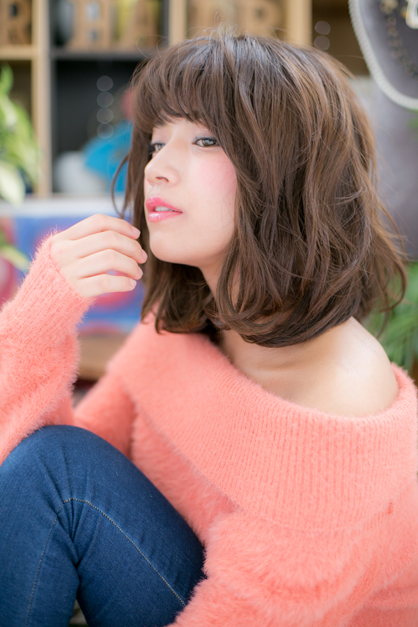厚めのフリンジバングで目元を強調。サイドの毛流れで輪郭カバー。目力UPと小顔見せを叶えます。程良い抜け感あるリラクシーミディで、どこから見ても大人かわいいスタイルに。ベージュカラーやメルトカラーがお似合い。