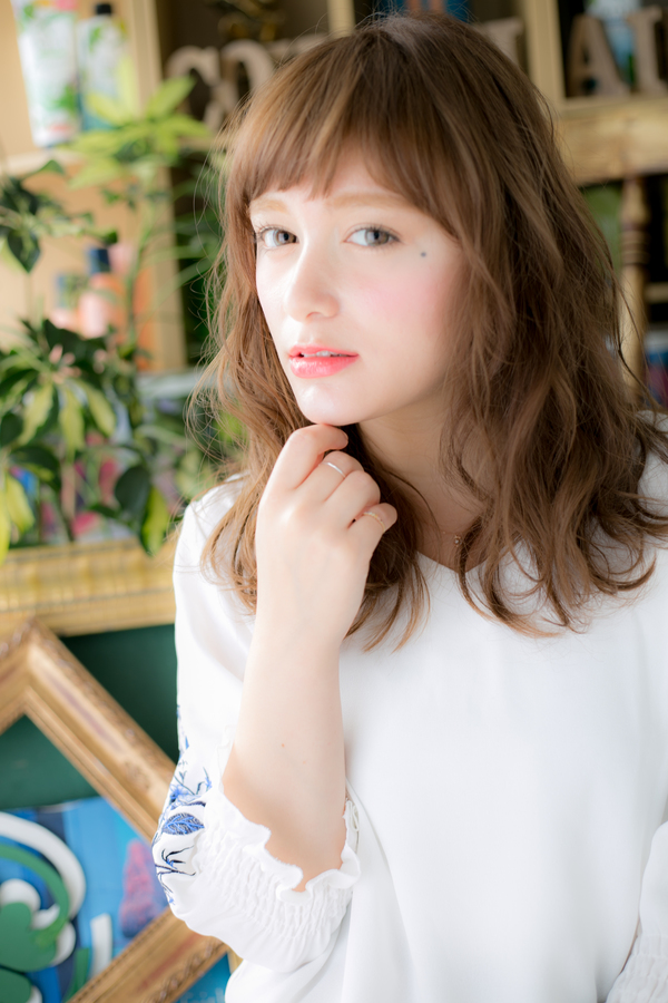 ゆる巻きカールと透け感バングで、やわらかフェミニンな印象に仕上げたエアリーセミディ。ラフな抜け感を残し、リラクシーで肩ひじ張らないエフォートレスな雰囲気に。旬顔にアップデート!
