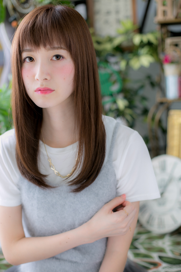 全体的にタイトにおさえて小顔効果UPさせた美髪ストレートヘアのスタイルです。透け感ある人気のカラーで斜めバングや厚めバングで目力強調で大人女子のファションにおすすめ!前下がりでクールにしたり、くせ毛風カールでフェミニンにしてヘアアレンジしやすい大人かわいいスタイル♪(メイク担当:川口店 成田)