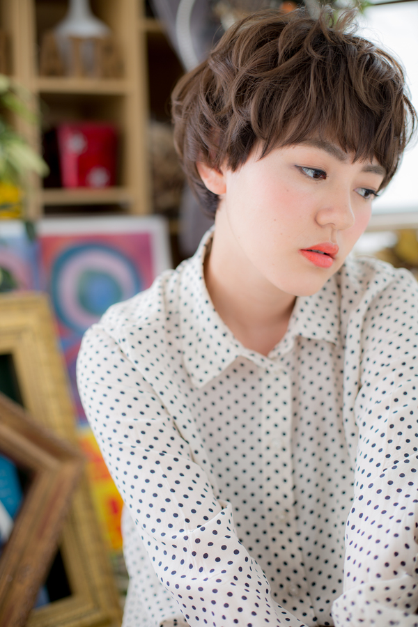 外国の子供のようなくしゃっとしたくせ毛風のエアリーショートのヘアスタイル。厚めバングと合わせて小顔見せ&目力UPでヘアアレンジしやすい!。ラフショートは無造作なかきあげや斜めバングでフェミニンにしても大人かわいい。30代・40代にもおすすめ!(メイク担当:川口店 成田)
