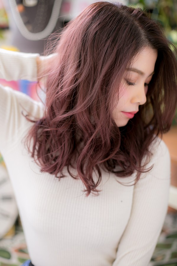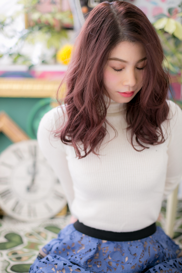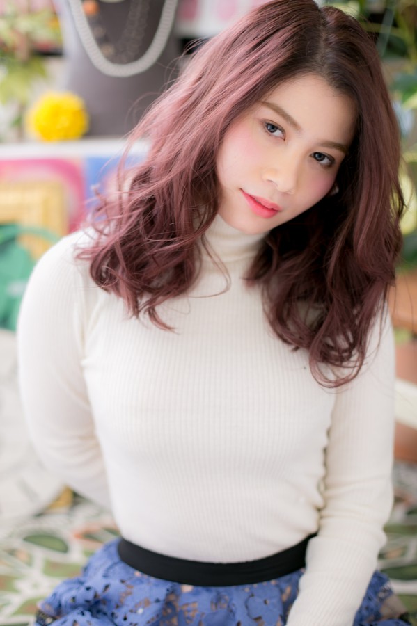 ぱっと目を引くレッド系カラーで個性的なラブグラマラスロングに。ピンク系のからーもおすすめ!頬にかかる前下がりラインで小顔見せ。無造作なかきあげバングでセクシーにして大人女子のファションに◎。斜めバングや厚めバングでフェミニンにヘアアレンジ◎30代・40代にもおすすめ!(メイク担当:川口店 成田)