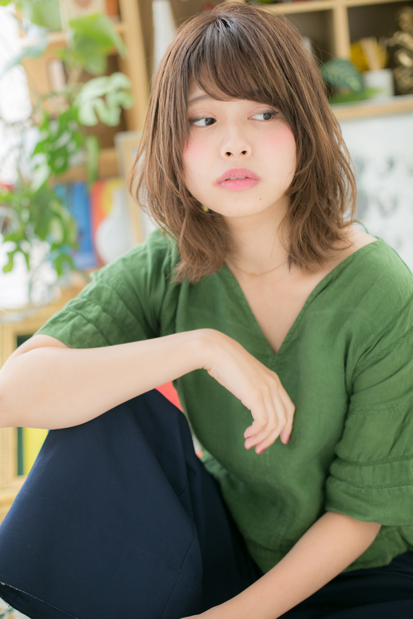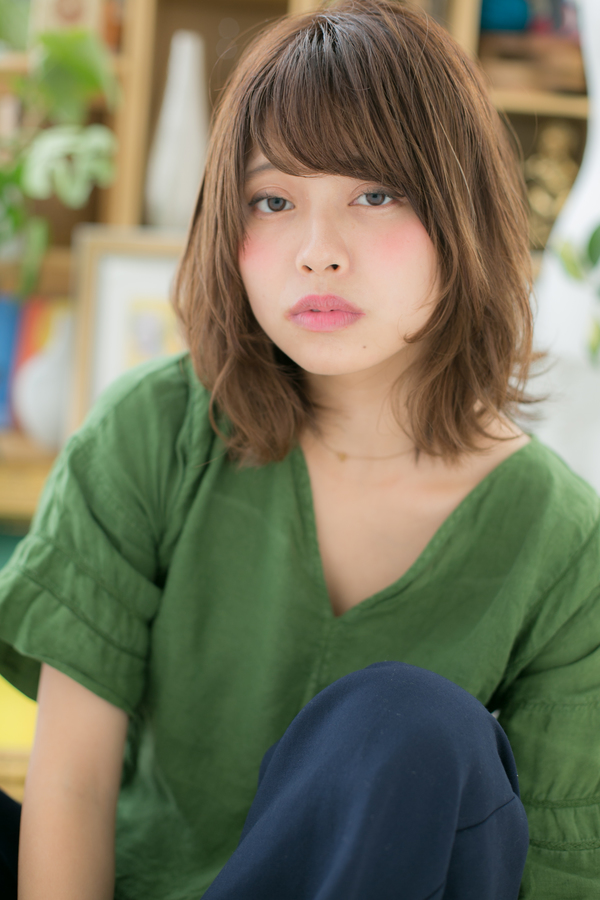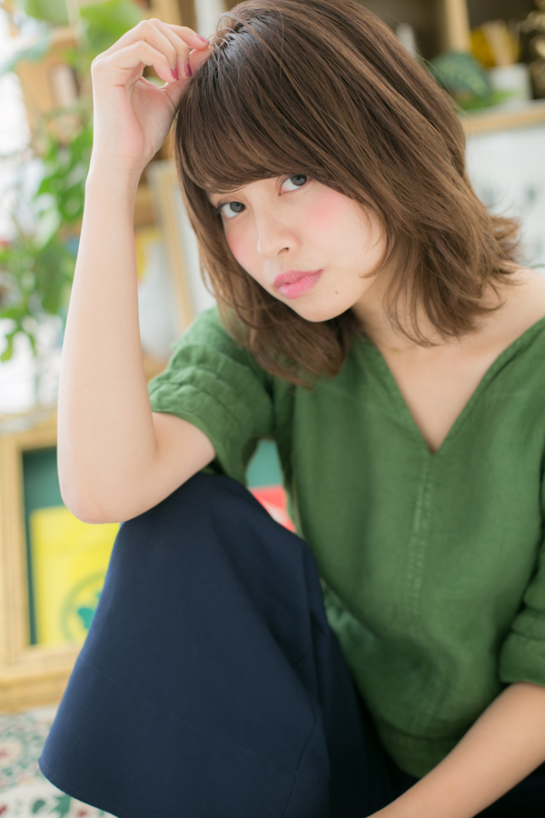 くせ毛風のラフな外ハネカールでナチュラルミディをラブカジュアルにヘアアレンジ☆斜めバングや厚めバング、ジグザグバングで目力UPで大人女子のコーデを完成!ミディアムヘアを際立たせるグラデーションや暗めのベージュで髪の毛の悩みも解決!人気のカラーやアッシュグレー、グレージュ、ブリーチなしもおすすめ!30代・40代にも◎(メイク担当:川口店 成田)