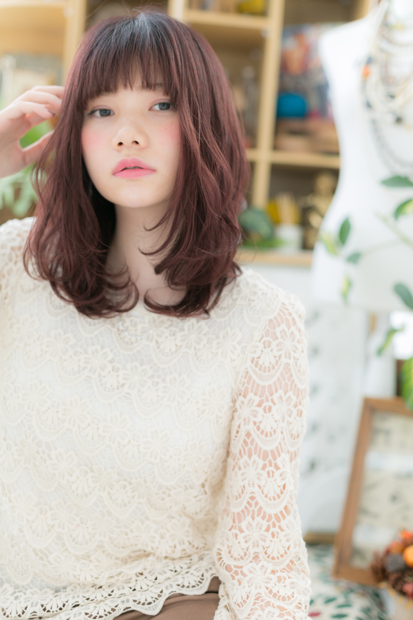 結いてほどいたようなでくせ毛風カールふわミディのヘアスタイル。シースルーバングや斜めバングでフェミニンにしたり、厚めバングも個性的で大人かわいい。ミディアムヘアを際立たせるグラデーションで髪の毛の悩みも解決!ボルドーやピンクカラーで旬顔で大人女子のファッション度UP。30代・40代にもおすす☆(メイク担当:北浦和店 棟方)