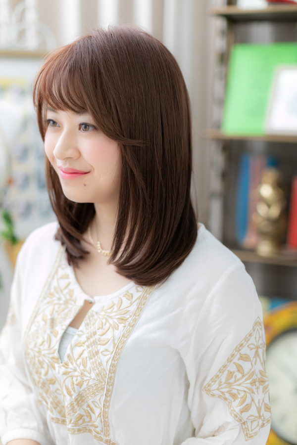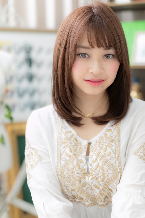 斜めバングで目力UPしたガーリーワンカールで大人女子のファッション度UP。ミディアムヘアを際立たせるベージュやグラデーションで暗めの髪の色もおすすめ。ピンクブ系のラウンやピンク系のアッシュも大人かわいい。耳かけや前下がりで小顔に。40代のエラ張り対策にも◎(メイク担当:川口店 岩淵)