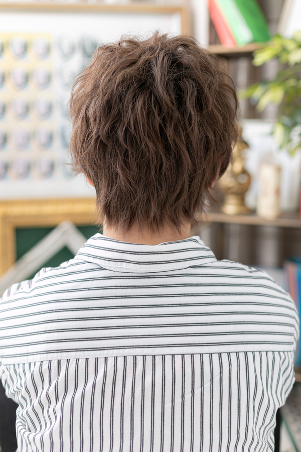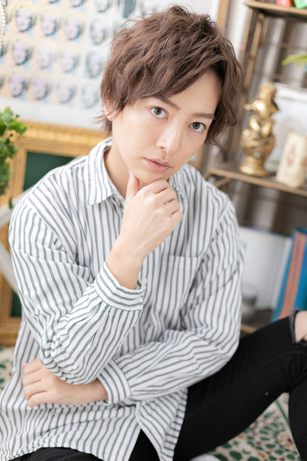 マットなくせ毛風パーマでやわらかな印象に仕上げたフェザーマッシュ。無造作なかき上げヘアでリラクシーに仕上げつつセクシーで色っぽい雰囲気に。ベージュカラーやハイトーンもカッコイイ。(メイク:川口店担当岩渕)