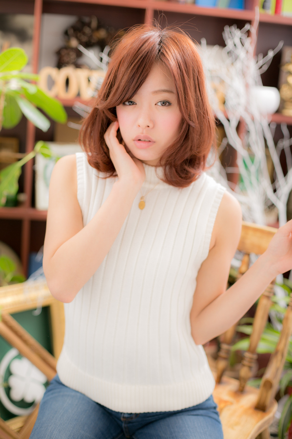 クセ毛風なワンカールパーマとオレンジ系の色味で第一印象UP!のオシャレ可愛いセミディ。柔らかくふんわり見せたい方にオススメなスタイルです。
