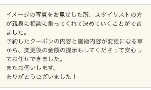 ご希望のスタイルによっては、ご予約頂きましたクーポンより変更・追加になる場合もございますが、料金提示・説明等を明確にご不安がない様心がけております。