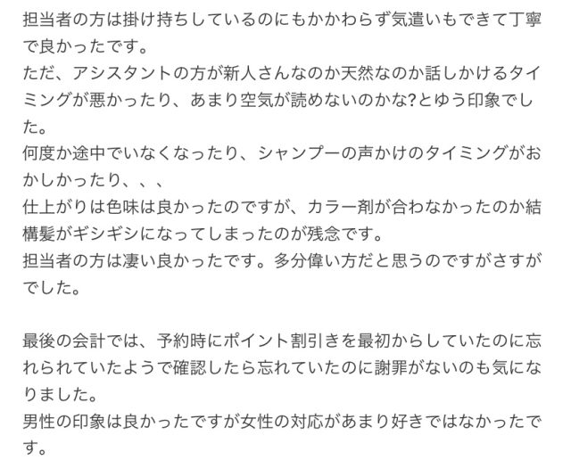 アシスタントと受付を対応したスタッフの接客面で不快なお気持ちにさせてしまったこと心よりお詫び申し上げます。