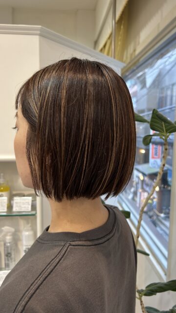 ぱつんとした切りっぱなしボブにハイライトが可愛いヘアスタイルのお客様