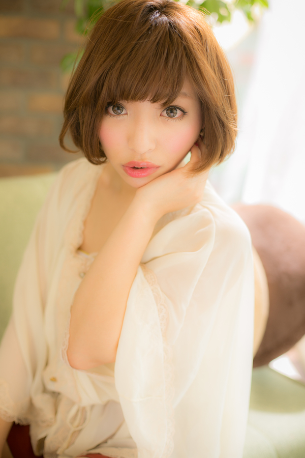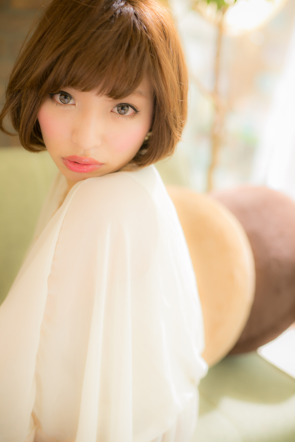 明るいカラーで柔らかく,まとまりのあるボブスタイル。自然に内側に丸みが出るくらいのパーマをかけているので,ナチュラルなふんわり感がポイント。眉ラインでそろえたバングで甘さもだし,大人っぽすぎない女子力UPの魅惑なボブ。