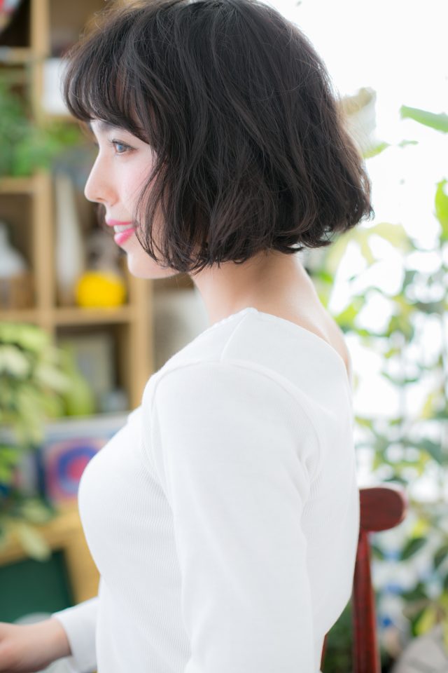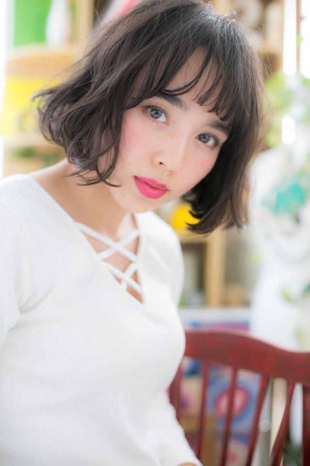 前下がりで小顔にメイクしているので、ボブ初挑戦の方にもオススメ。斜めバングや厚めバングで目力UPしたり、無造作質感の切りっぱなしボブもラブカジュアル。耳かけも大人かわいい。パーマで簡単スタイリングが嬉しい。ヒアルロン酸カラーは白髪にも対応可。