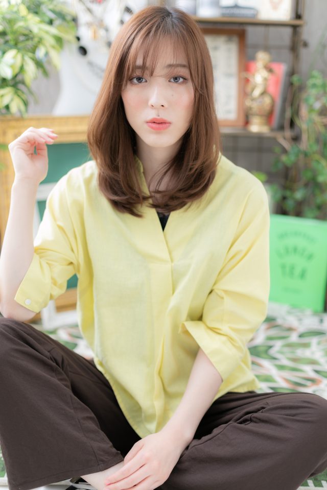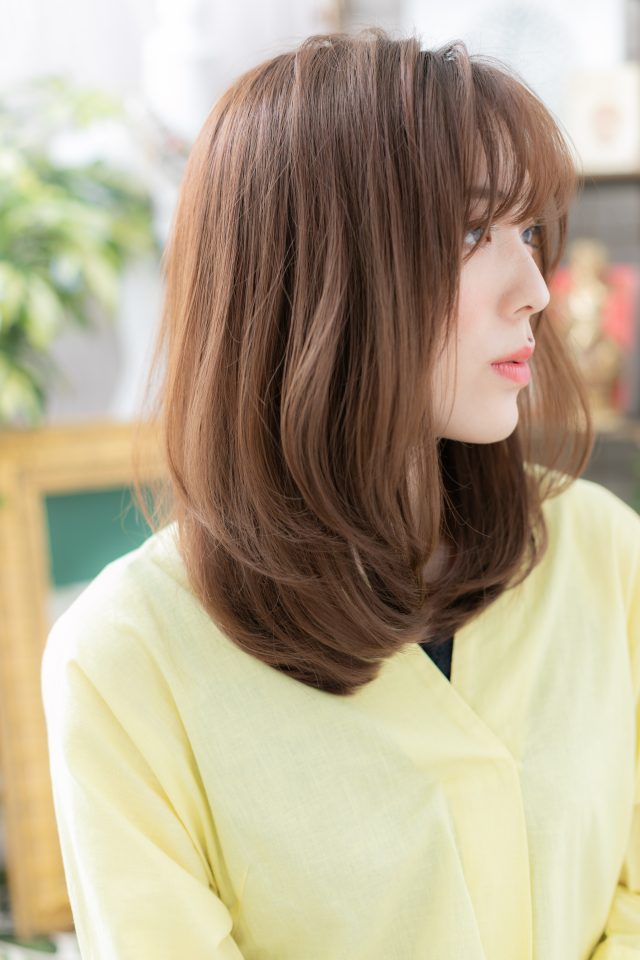 前下がりで小顔効果のワンカールストレートのヘアスタイル。大人女子のファッション度UP!ミディアムヘアを際立たせるグラデーションや暗めのベージュの髪の色もおすすめ!ベージュカラーで明るくしたり、黒髪でクラシカルにヘアアレンジもOK。(メイク担当:川口店 成田)