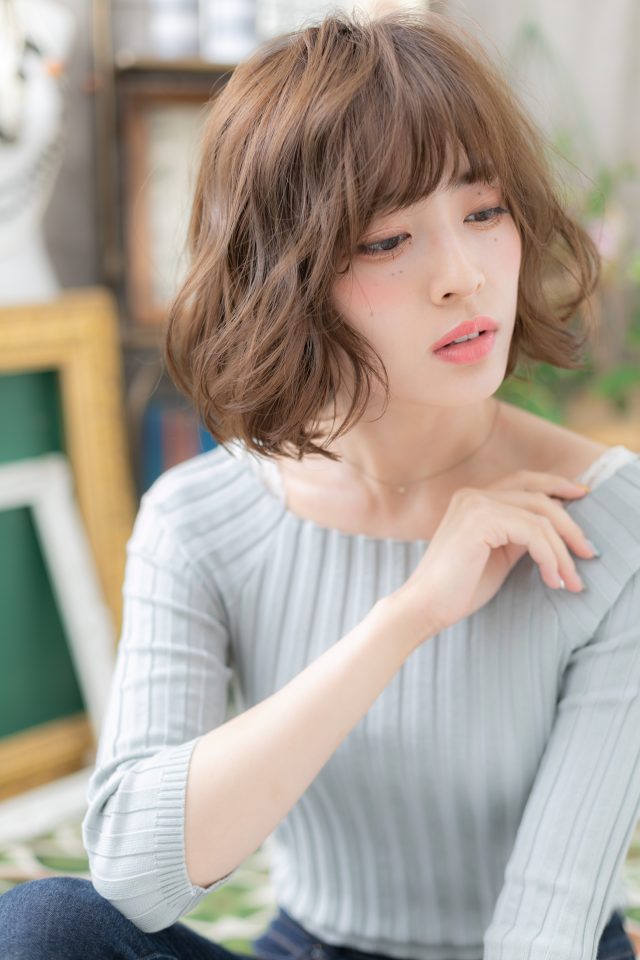 シースルーバングとレイヤーカットで透け感を出してラブカジュアルに。ナチュラルボブやフェミニンボブ、大人ボブや前下がりボブからのイメチェンにオススメ。ミルクティーブラウンやシアーカラーも旬の髪型。