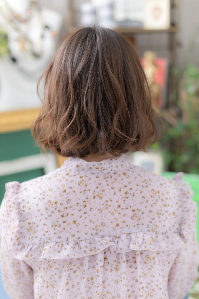 前下がりで小顔見せ効果。無造作パーマや外ハネミディでラブカジュアルにイメチェンも◎シースルーバングや厚めバングで目力UPしてもOK。ミルクティーブラウンやミルキーベージュの暖色系カラーもフェミニン。
