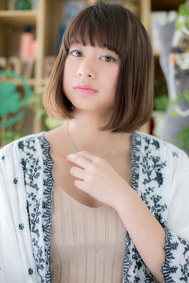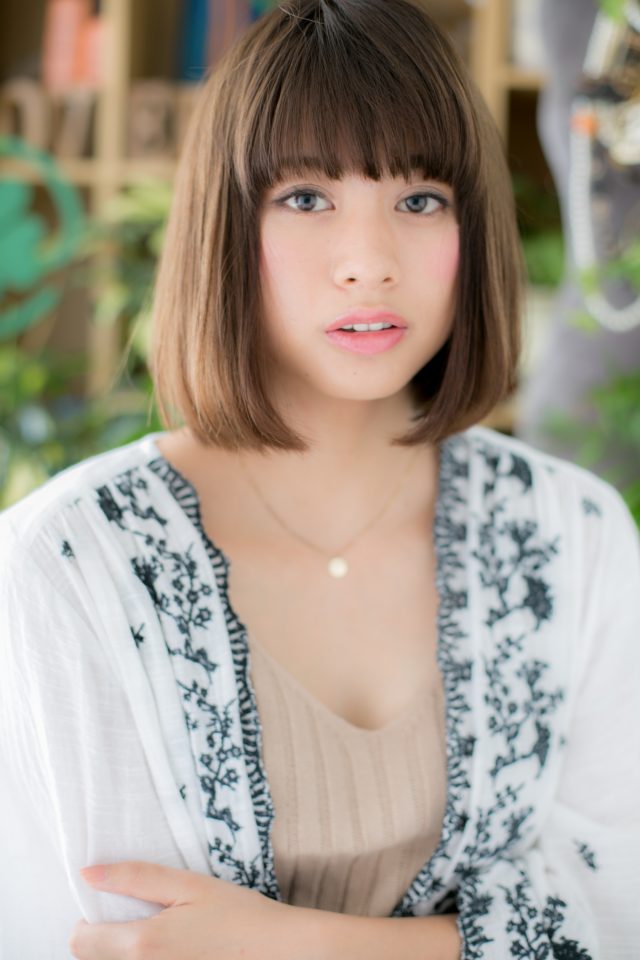 ローレイヤー&暗髪でクールに決めたクラシカルボブ。顔周りを包み込んで気になる輪郭をカバーしシャープに見せます。ぱっつんワンドバングをオンして、目元を印象つけ、あどけない印象に。甘辛MIXで個性的ガーリーに♪