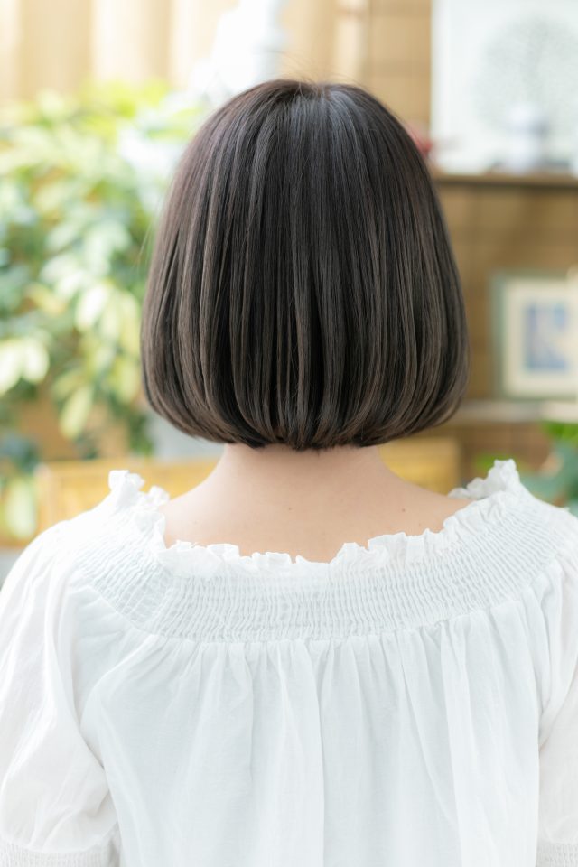黒髪艶カラーが大人かわいい小顔前下がりボブ