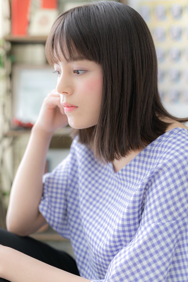 前下がりで小顔で大人女子のコーデも完成。斜めバングや厚めバングも大人かわいい。くせ毛風ゆるふわミディや耳かけもモテヘアスタイル。30代・40代にもおすすめ(メイク担当:川口店 成田)