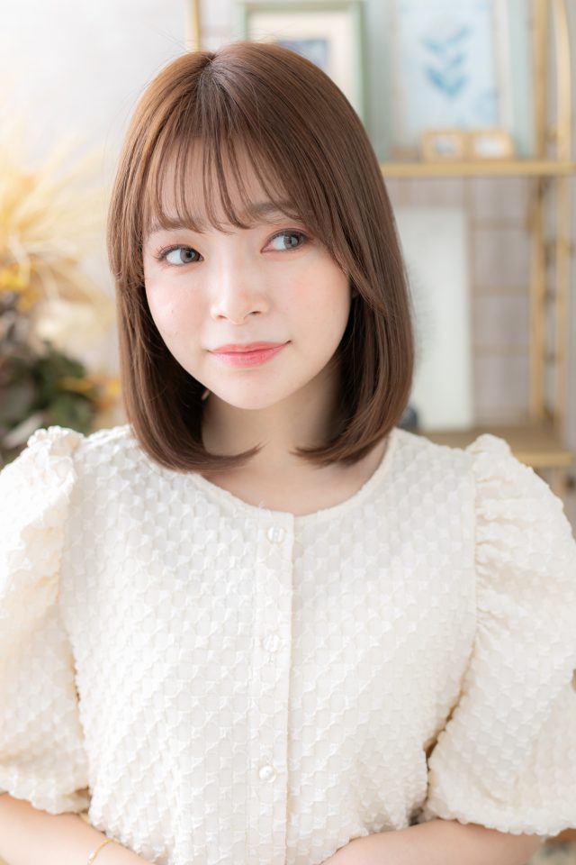 大人ボブ前下がりボブ、切りっぱなしボブミニボブから伸ばしかけに。斜めバング厚めバング、シースルーバングかきあげ前髪で小顔。くせ毛風ゆるふわミディや耳かけ前下がりも大人かわいい。(メイク担当:川口店岩渕)