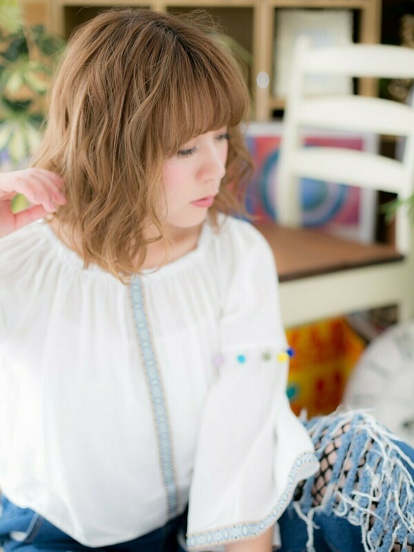 顔周りを華やかにするくせ毛風カールが大人かわいいふわミディ。斜めバングや厚めバング、透け感バングで目元を印象つけて。前下がりで小顔に見せれば女の子度UP!耳かけもGOOD!(メイク担当:北浦和店 成田)