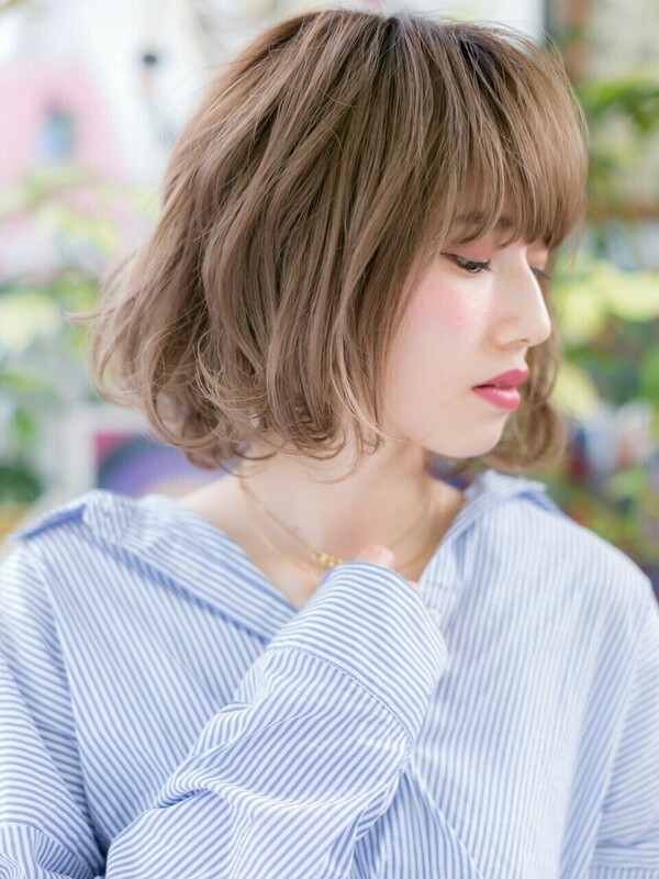 ナチュラルボブからのイメチェンにオススメ!くせ毛風シースルーカールのやわらかフェミニンボブ。斜めバングや厚めバングで目力UPしたり、前下がりで小顔にして大人かわいい印象に。(メイク担当:COVERHAIRGROUP 中田)
