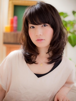 思わず触れたくなるような艶感が、ピュアな雰囲気を演出する透明感たっぷりのゆるカールヘア。重たくなりすぎないように、前髪には動きをプラス。顔回りを包み込むようにレイヤーを入れて小顔効果もバッチリ!
