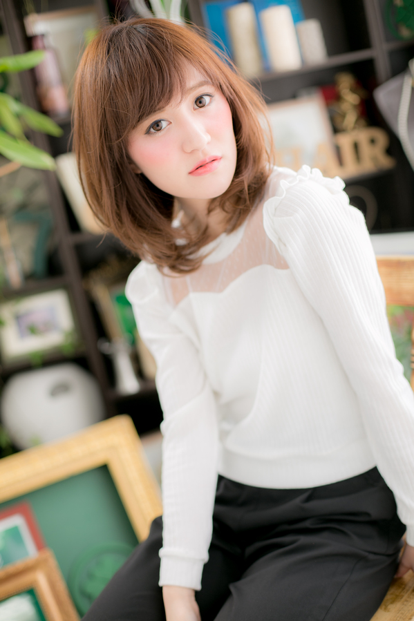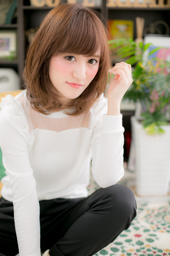 女性らしい丸みのあるフォルムのミディアムスタイルです。ふんわりしたカールなので、スタイリングも手がかかりません。前髪も目の上ギリギリラインで目力もUP☆