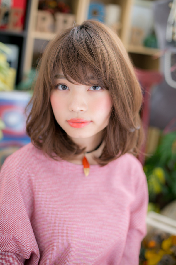 目の上ギリギリの長めバングとゆるふわ内巻きカールで重めに仕上げたミディアム。しっとりまとまりつつも、ふわっと軽やかな印象に♪