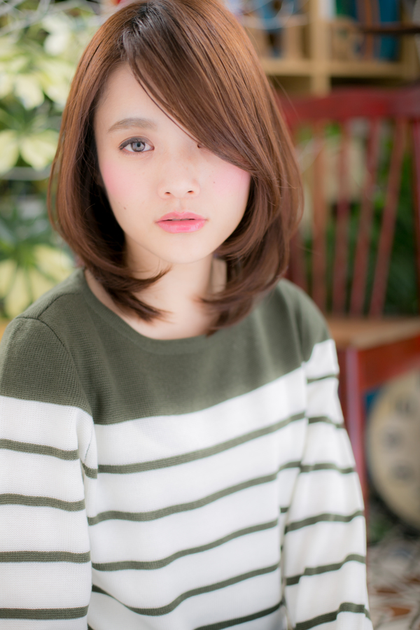 顔だちを綺麗に見せてくれるひし形フォルム。サイドに流した斜めバングは、シンプルながらも艶っぽくてGOOD。ツヤカラーで肌色を明るく毛先のレイヤーで軽やかに見せて、上品な清潔感をKEEP!